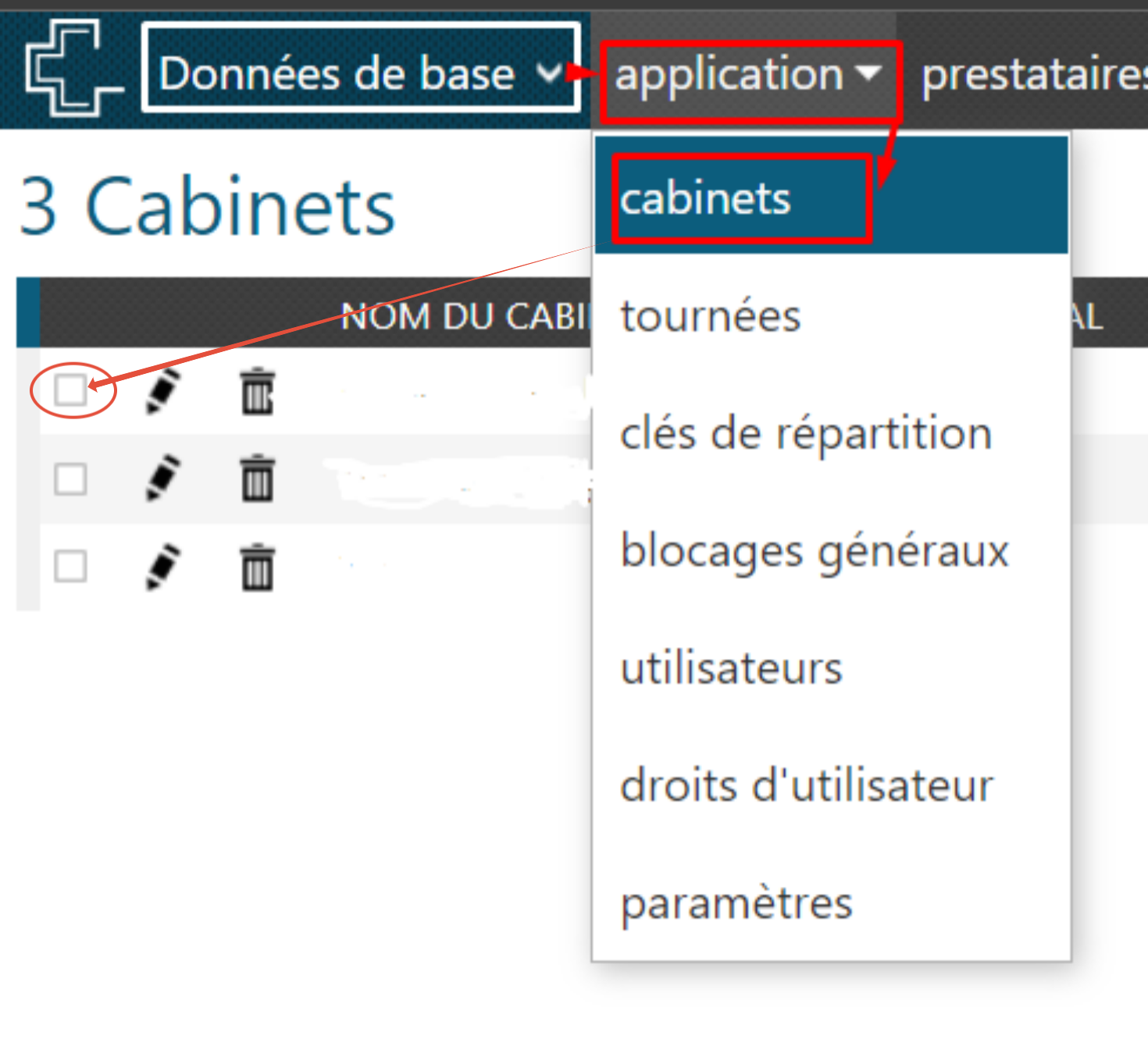 Pour modifier un cabinet, cochez le cabinet concerné