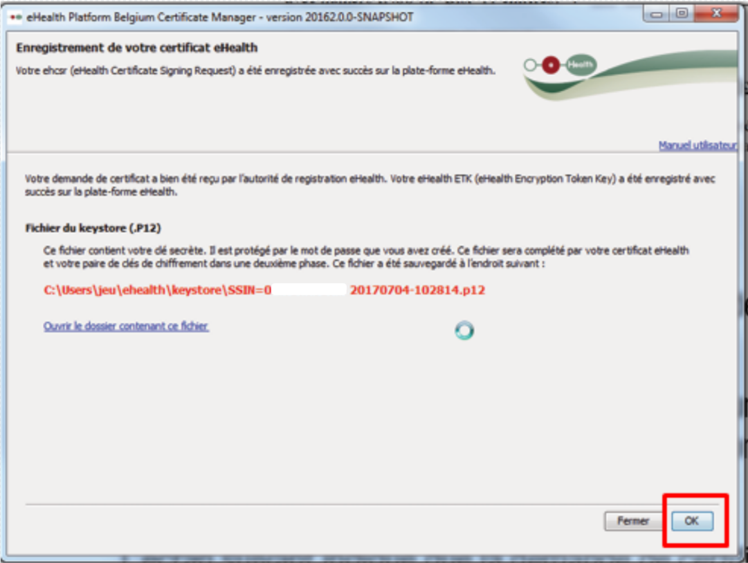 L'écran suivant vous confirme l'enregistrement de votre certificat eHealht, il vous suffit de cliquez sur le bouton "ok"