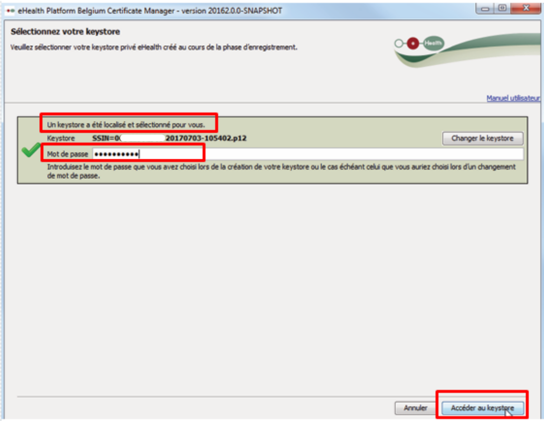 Introduisez le mote de passe que vous avez créé lors de la demande et cliquez en bas à droite de votre écran sur le bouton "accéder au keystore"