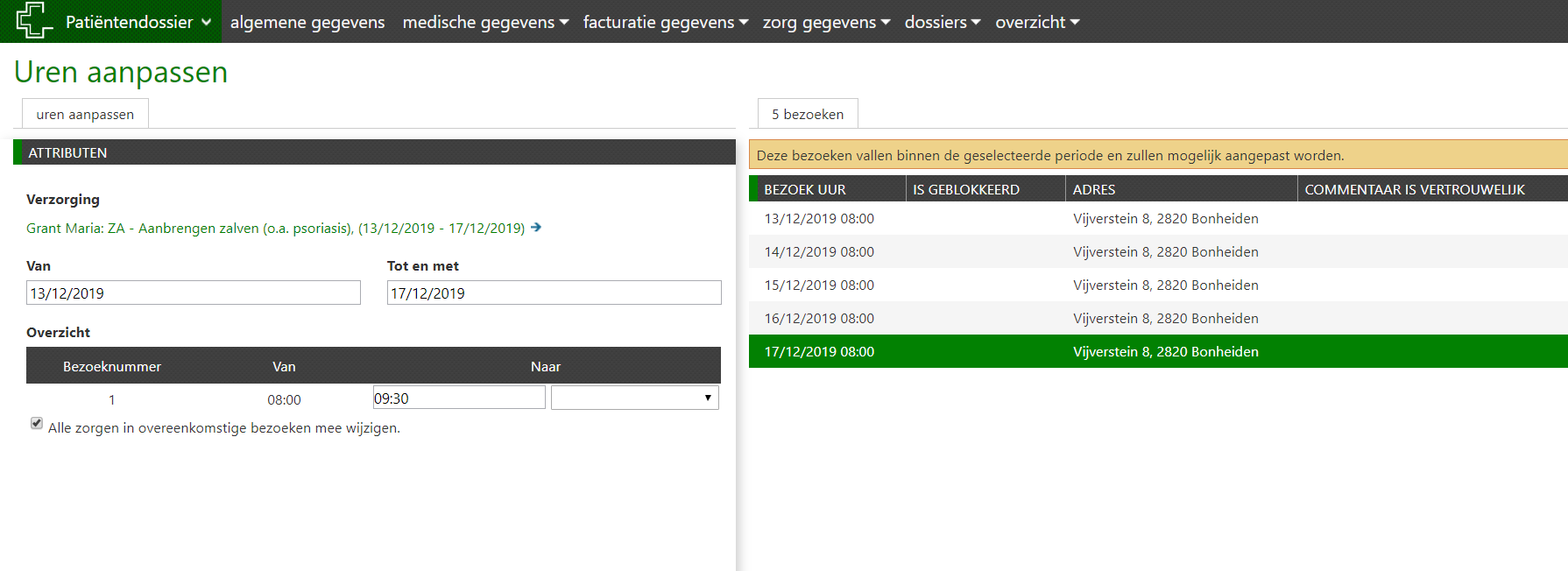 Indien u het vakje aankruist 'alle zorgen in overeenkomstige bezoeken mee wijzigen' worden alle verzorgingen uit de betreffende bezoeken mee gewijzigd naar het nieuwe uur