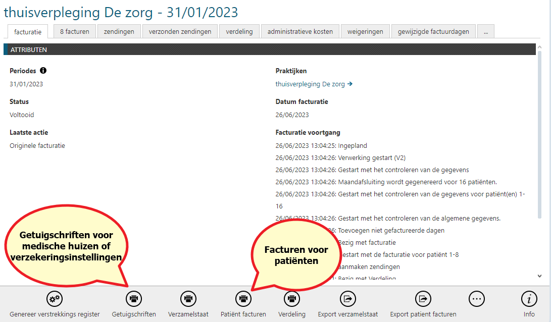 Facturen voor verzekeringsinstellingen of medische huizen druk je af met de knop Getuigschriften.